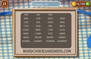 Word Cookies Tiramisu 16 Word Cookies Tiramisu Level 16 Answers Welcome to this page the Answers for the Word Cookies Tiramisu Level 16 can be found below. Word Cookies Tiramisu Level 16 Answers and Solutions. In this new game the fun goes on and all word experts are welcomed.