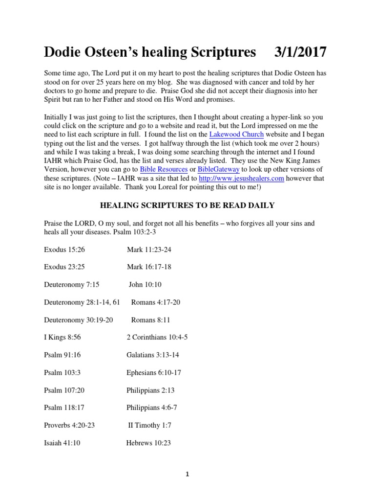 Dodie Osteens healing Scriptures Posted. Dodie Osteens Healing Scriptures in the King James Version. Please pray for strength in my faith and that my healing is.